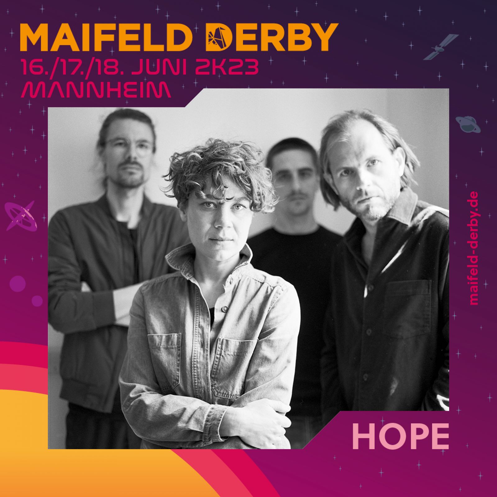 Der Sommer 2023 verspricht ein besonderer zu werden für Hope aus Berlin. Gerade wurden sie von Depeche Mode als Support für einen Teil derer Stadion Tour eingeladen. Da fungiert das Maifeld Derby dann quasi als Warm Up. Schwer zu greifender, sehr eindringlicher & mitreisender Post-Indie-Ambient-Rock. Wurde Zeit, dass die uns besuchen kommen.